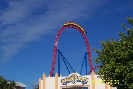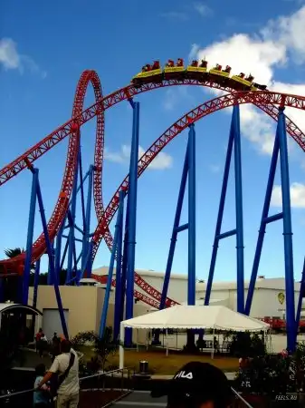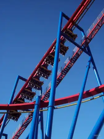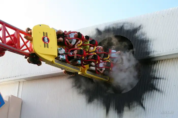 Аттракцион "Супермен зе искейп" в парке "Гора шести волшебных флагов" г. Валенсия (США) - американская горка с 2 дорожками и вертикальным переворотом. 15-местная гондола, запущенная линейным асинхронным двигателем, достигает высоты 126,5 м и вертикально переворачивается на скорости 160 км/ч.