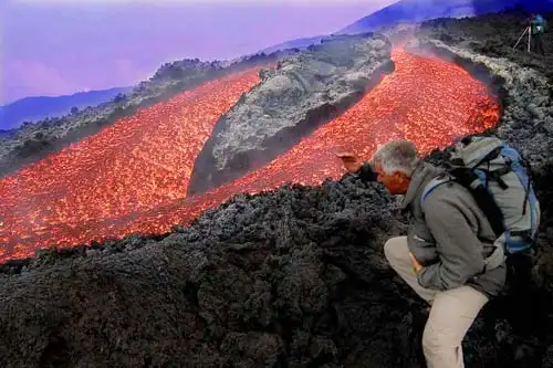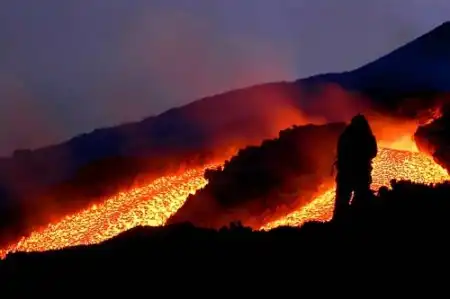 Это склоны Этны, одного из самых известных действующих вулканов Европы, находящегося на Сицилии. Река лавы неожиданно вырвалась из образовавшейся раны в восточном спуске с горы и ринулась вниз.