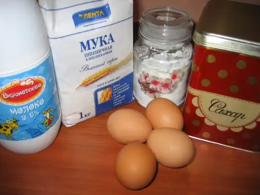 1. Соединяем муку с крахмалом, яйцами, сахаром, молоком (добавим 0,5 стакана воды и чуть-чуть соли), тесто должно немного постоять.