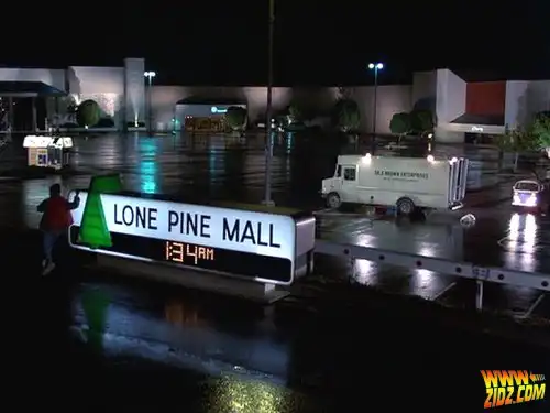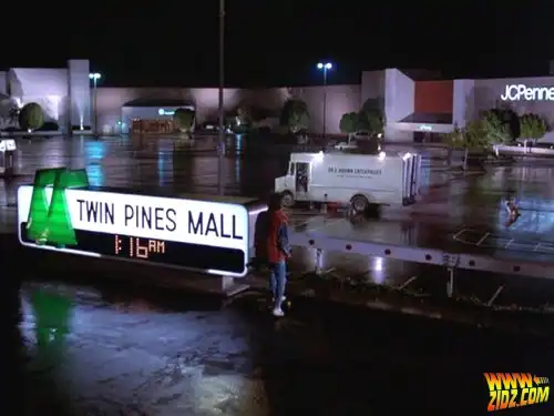 В начале фильма Марти подъезжает встретить Дока к торговому центру «Две елки» (Twin Pines Mall). Так как он раздавил одну из елок Пибоди в 1955 году, в конце фильма торговый центр называется «Одинокая елка» (Lone Pine Mall).