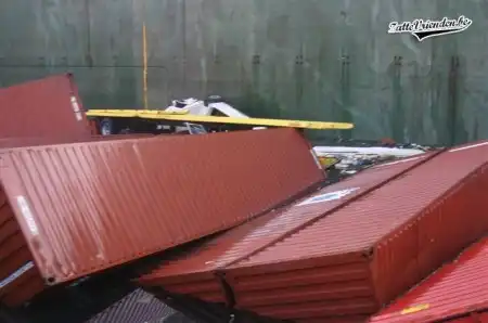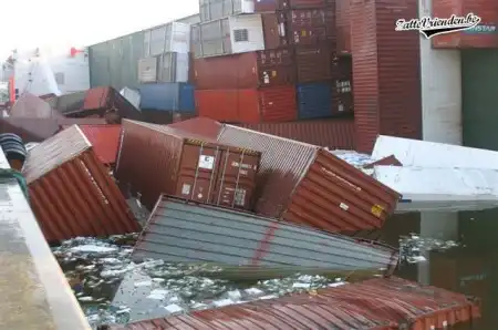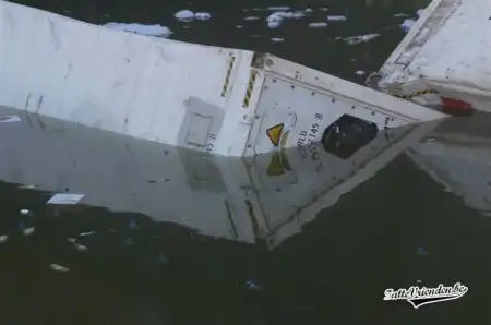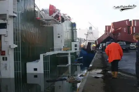 По его словам, судно медленно накренилось на один из бортов, при этом в воду сползли около сотни контейнеров и автомобилей. Сейчас судно лежит на дне, часть его корпуса возвышается над водой.