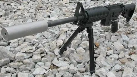 Одно из исполнеий М16А3. вместо ДТК накручен прибор для беспламенно-бесшумной стрельбы. Рукоятка земенена на универсальную планку, на которую можно установить оптический, коллиматорный или любой другой прицел. Кроме того, винтовка оборудована сошками: