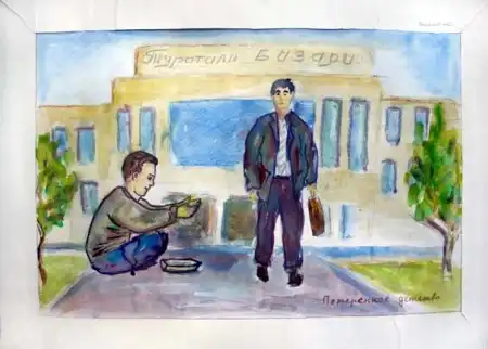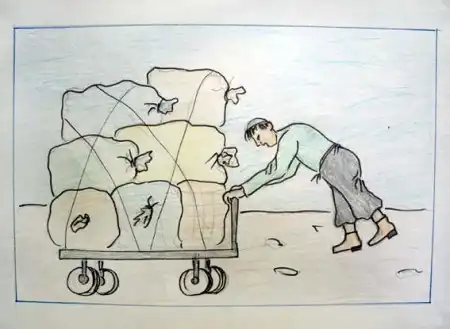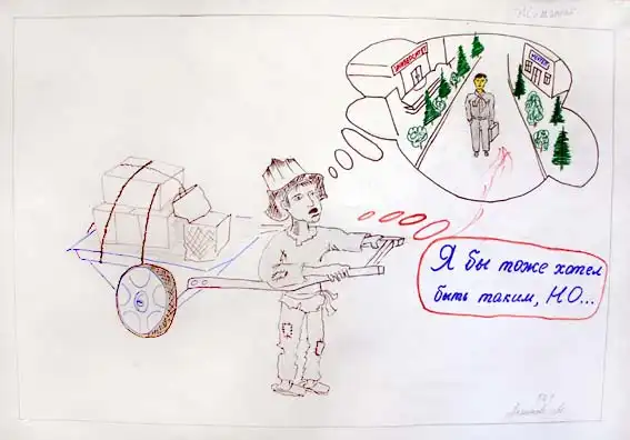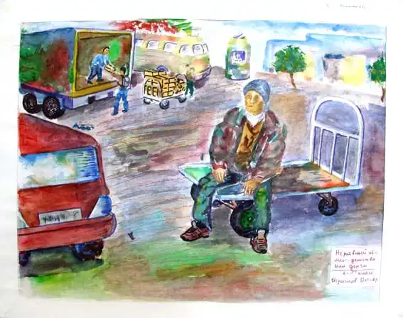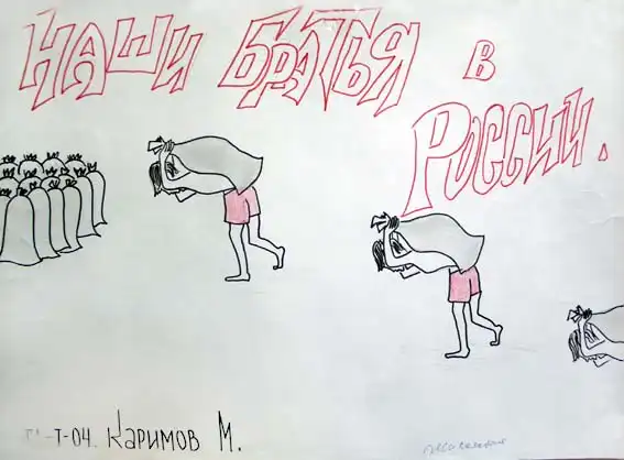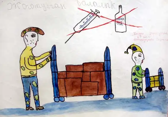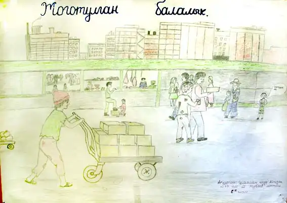Кыргызские дети рисуют себя и своих сверстников, работающих на табачных и рисовых плантациях, толкающих нагруженные тележки на рынках, моющих машины и чистящих обувь. Они хотят учиться, но вынуждены идти работать, потому что их родители не в силах прокормить свои семьи – зачем нанимать на работу взрослых или платить им приличную зарплату, когда столько детей ищут заработка и работают за копейки?