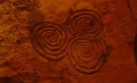 Все эти камни, а также стены коридора и погребальной камеры покрыты орнаментом, состоящим из зигзагообразных линий, треугольников, концентрических кругов, но наиболее часто встречается изображение загадочной тройной спирали. Этот символ был широко распространен в неолитическом искусстве и, как предполагают исследователи, был связан с циклом смерти и возрождения.