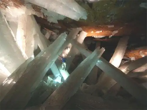 Когда магма остыла и температура в недрах опустилась ниже 58 градусов, ангидрит начал распадаться, обогащая воду молекулами кальция, которые в течение миллионов лет оседали в пещерах, формируя огромные селенистокислые гипсовые кристаллы...
