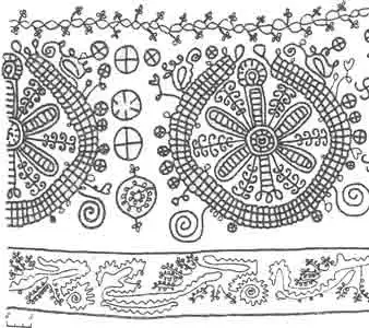 Этот календарь представляется не осколком более протяженной календарной системы, это классический представитель древнего народного календаря, который можно назвать "неполным". Впрочем, со временем дополнительные "кувшины" могли прибавляться, так как период, подвергавшийся календарному счету, постепенно удлинялся, но всегда должен был сохраняться элемент разрыва и последовательности чисел - того разрыва, при помощи которого здесь преодолевалась иррациональность длительности солнечного года. Схему народного календаря на наиболее позднем этапе его развития можно видеть в своеобразных вышитых узорах, бытовавших в Каргополье вплоть до конца XIX - начала XX века. К сожалению, расшифровка древнего аспекта этих узоров еще не проводилась. Обычно приводится поздняя народная версия, полностью совмещающая контур этого календаря с кругом юлианского. Но при этом совершенно не учитывается наличие разрыва в календаре-вышивке и то, что число делений на нем не равно и не кратно числу дней юлианского года. Однако "неполнота" народного календаря требовала ежегодного подтверждения астрономическими наблюдениями, и это неудобство оказалось его преимуществом - наблюдения и ежегодная привязка к какойлибо точке солнечного цикла служили средством, обеспечивающим точность этого календаря.