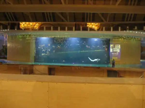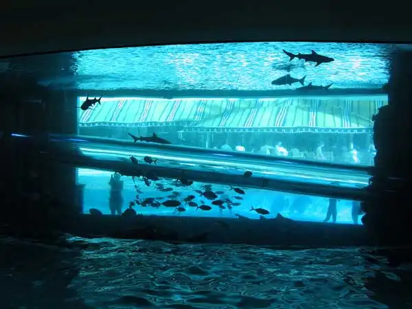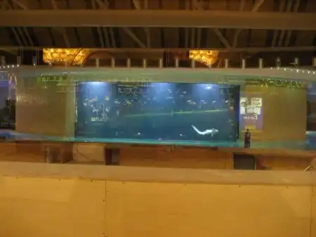 Владельцы лас-вегасского отеля Golden Nugget придумали для своих посетителей новое развлечение: они расположили в центре гостиницы стеклянный резервуар вместимостью 756 000 л с 10-метровым водопадом и запустили в него несколько акул. Сквозь огромные витрины за морскими хищницами можно вести наблюдение из бассейна, джакузи и бара, которые расположены по соседству. Аквариум доступен для осмотра с 10.00 до 18.00.