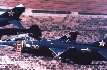 Но есть в судьбе Як -38 и интересные сухопутные страницы. Так, в начале 1980 г. по решению МО и МАП была сформирована опытная эскадрилья из двух штурмовиков Су-25 и четырех СВВП Як-38 (борта "25", "53", "54", "55").