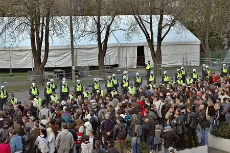 Эстонский спецназ взял в кольцо сквер, в котором установлен монумент. Часть пикетчиков сумели прорвать оцепление, но были остановлены подоспевшей к этому времени второй группой полиции. После второго натиска специальное отделение таллинской полиции начало избивать манифестантов резиновыми дубинками и пустило в ход баллончики со слезоточивым газом.