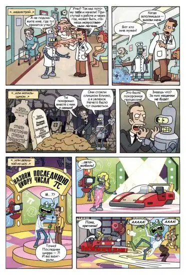 В комиксе №13 «Бендер, говоришь?» фигурирует конкурсный вопрос «какова последняя цифра в числе π?». Конечно, число π, как и положено иррациональному числу не может иметь последней цифры. Но пойди, докажи, что это не семёрка...