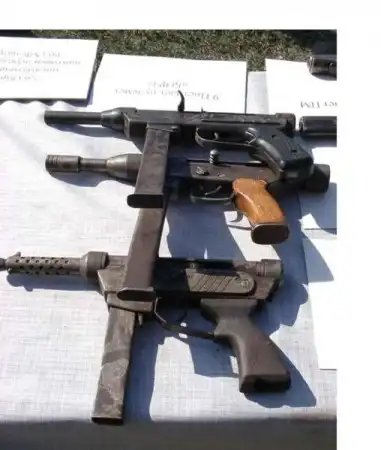 Борз (Борс) первых модификаций. Плечевых упоров на них уже нет, зато на нижней модели имеется комбинация ограждения ствола и пламягасителя. Фурнитура на нижней моделе выполнена либо из пластика либо из дерева "под пластик". В отличии от армянского варианта в ствольную коробку вставлена труба по типу "СТЭНа" в качестве направляющего елемента затвора