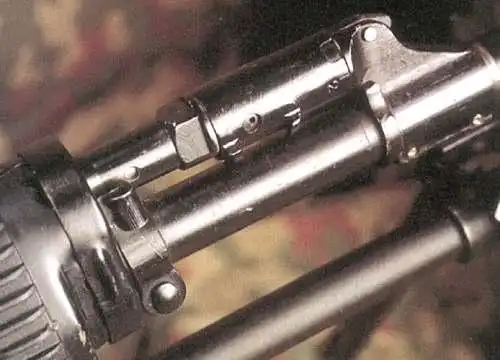 Существенных дополнений потребовали сошки. Для их установки использована особая горизонтальная штанга, жестко укрепленная впереди ствольной коробки. Шарнирное крепление сошек и угол разведения допускают поворот их относительно оружия. Сошки могут поворачиваться вокруг своей оси на 90 градусов вправо или влево. Сами сошки - телескопические, с четырьмя фиксированными установками по высоте (максимальная высота 320 мм).