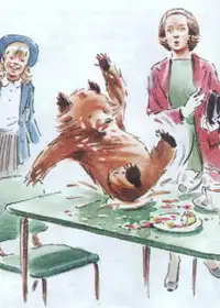 Чета Браунов сразу решила приютить мишку у себя дома. Первым делом его повели в буфет перекусить, и тут же начались приключения. Сначала все было хорошо, они выбрали столик в углу у окна, и мистер Браун пошел за едой. Вскоре он вернулся с двумя чашками чаю и свежими аппетитными булочками.