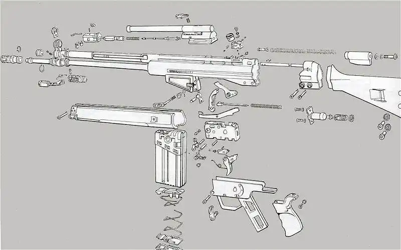 Винтовка G3 - автоматическое оружие, построенное на основе автоматики с полусвободным затором. Замедление открытия затвора осуществляется при взаимодействии пары роликов с хвостовиком ствола и затвором, состоящим из двух частей. При этом в первый момент ролики служат ускорителями задней части затвора, одновременно замедляя движение передней части затвора, удерживающей гильзу в патроннике. Сам патронник имеет продольные канавки (т.н. канавки Ревелли), призванные исключить "залипание" гильзы в патроннике. Общая схема автоматики была разработана в 1945 году на фирме Маузер, и более подробно описана в статье про 7.62мм винтовки СЕТМЕ. Ствольная коробка винтовки G3 выполнена штамповкой из стального листа. На ранних моделях корпус ударно-спускового механизма также был штампованный из стального листа, позже стал применяться пластиковый корпус УСМ, выполненный заедино с пистолетной рукояткой и спусковой скобой. Корпус УСМ крепится к ствольной коробке штифтом и при неполной разборке откидывается вниз-вперед после отделения приклада с затыльником ствольной коробки. При необходимости корпус УСМ может быть легко отделен от оружия для ремонта или замены путем извлечения штифта, расположенного позади гнезда для магазина. Сам УСМ курковый, переводчик режимов огня служит и предохранителем, расположен на левой стороне корпуса УСМ. Штатно имеет 3 положения - "предохранитель" - "одиночные" - "очередь", однако имеются и варианты УСМ с дополнительным режимом огня с отсечкой очереди по 3 патрона. Рукоятка заряжания складная, находится слева над стволом и не двигается при стрельбе. Прицельные приспособления на первых вариантах (G3 и G3А1) представляли собой мушку в кольцевом намушнике и перекидной открытый целик, на более поздних модификациях (G3А2, А3, А4) целик стал диоптрическим, в виде барабана с отверстиями для дальностей стрельбы 100, 200, 300 и 400 метров. Приклад с затыльником крепятся к ствольной коробке двумя штифтами и снимаются при разборке. Существует два основных варианта прикладов - нескладной из пластика (на моделях G3 и G3А2) и выдвижной телескопический, штампованный из стали с резиновым затылком (модели G3А1, G3А3). На самых ранних винтовках цевье было штампованным из металла, с отверстиями для охлаждения ствола. Позже цевье стало пластиковым, сперва также с отверстиями для охлаждения, на последних моделях - гладким, без отверстий. Ствол оснащен щелевым пламегасителем, использующимся также для метания винтовочных гранат. На него также может крепится штык-нож. Питание винтовки осуществляется из металлических магазинов на 20 патронов.