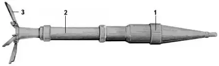 1-наружная труба, 2 - выдвижная труба, 3-передняя и задняя защитные крышки, 4-прицельное приспособление, 5-спусковое устройство, 6-ударный механизм, 7-головная часть гранаты, 8-взрыватель, 9-заряд ВВ, 10-кумулятивная воронка, 11-реактивный двигатель, 12-пороховой заряд двигателя, 13-сопло двигателя, 14-огнепроводная трубка, 15-перья хвостового стабилизатора.