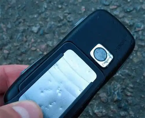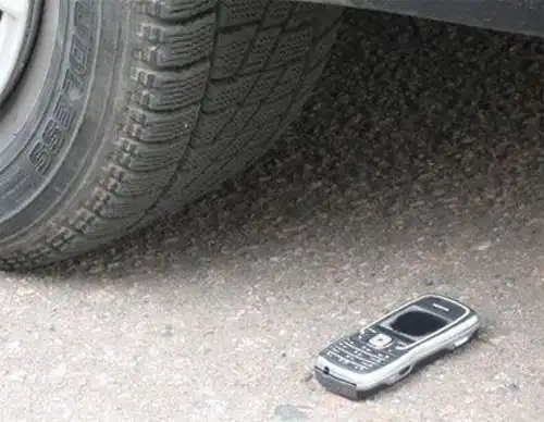 Ну и кульминация программы – Nokia 5500 под колесами автомобиля. Как ни странно, экран выжил. А вот линза на фотокамере – нет.