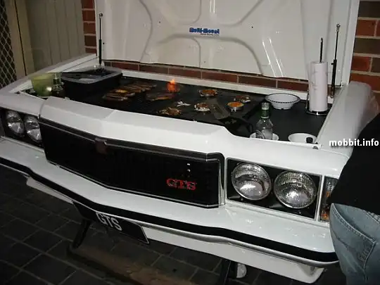 Этот девайс пополнит нашу пока небольшую коллекцию необычных грилей . Для создания этого гриля в жертву был принесен настоящий автомобиль Holden Monaro GTS. Некий австралиец полностью переделал переднюю часть автомобиля в гриль, дабы жарить в своем саду мясо кенгуру, страусов и другой австралийской живности :) Весьма оригинальная задумка, если только не жалко пустить автомобиль на такие цели.