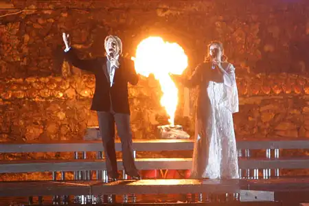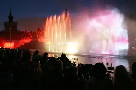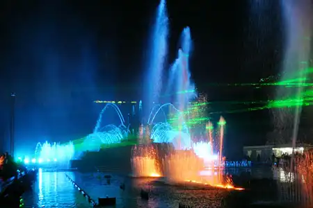 Торжественное открытие всемирно известного водного шоу "Танцующие фонтаны" - Aquatic Show прошло на ВВЦ. В программе мероприятия: аудиовизуальный спектакль "Водная феерия" - самый красивый водный балет в мире, танцующие фонтаны под музыку с подсветкой; видеопроекции, графические и бим-эффекты на водных экранах; гейзеры и искусственный туман, композиции с использованием новейших цветных и зелёных лазеров; пиротехнические эффекты. Шоу сопрвождалось выступлением Николая Баскова и солистки Большого театра Ларисы Рудаковой.