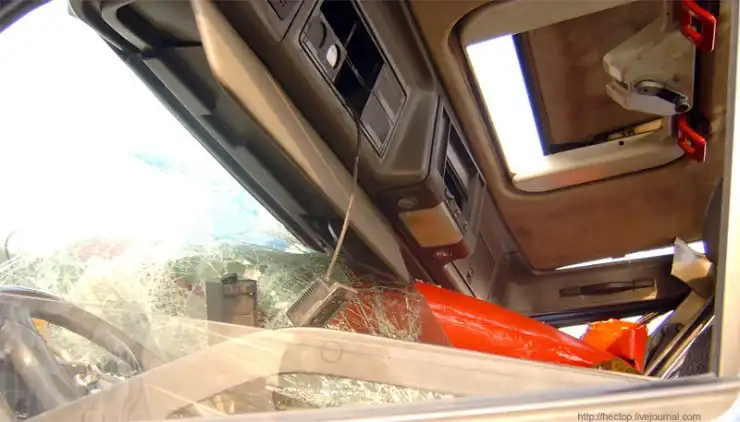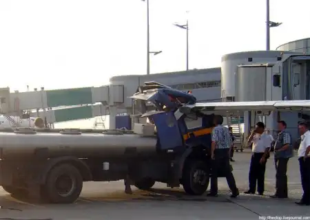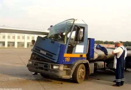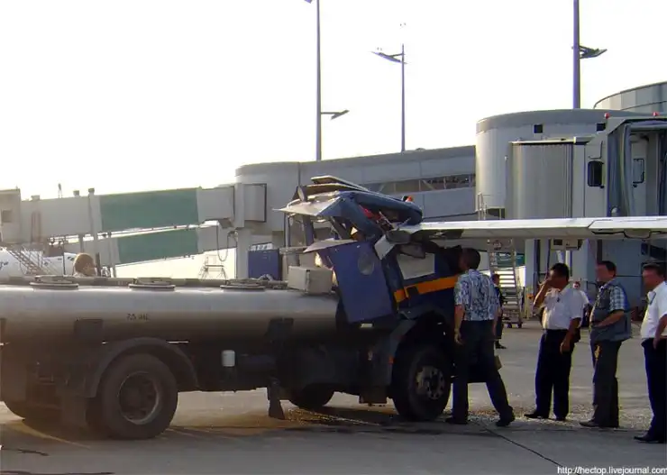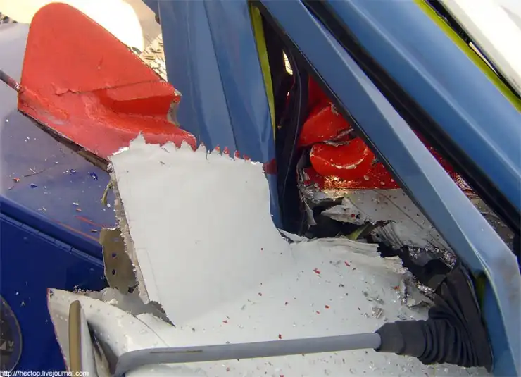 Машина врезалась в самолет. Осколки лобового стекла автомобиля полетели дальше, по движению машины, в силу инерции.