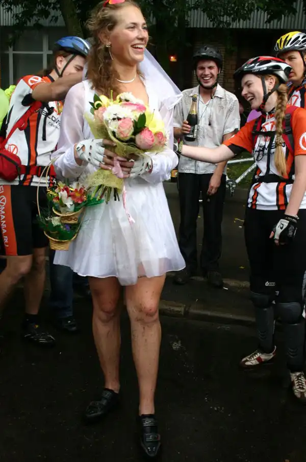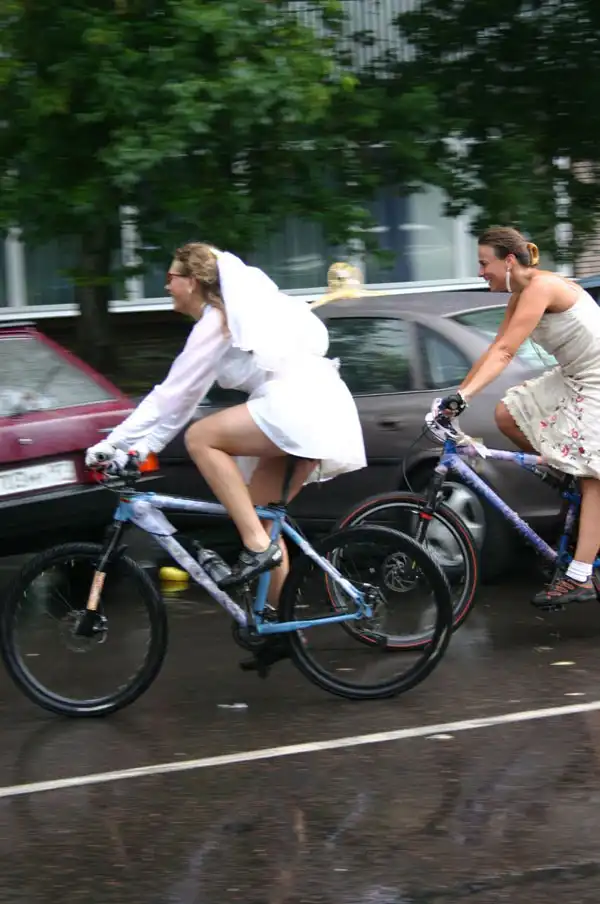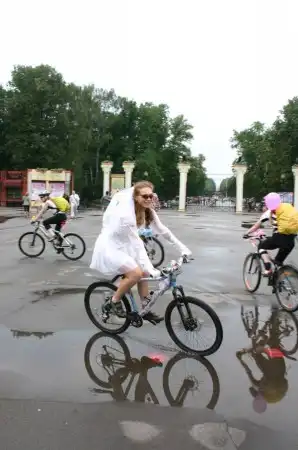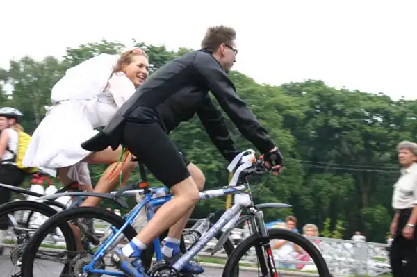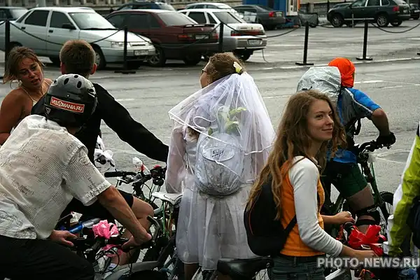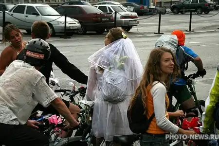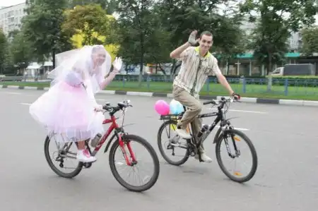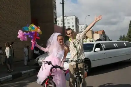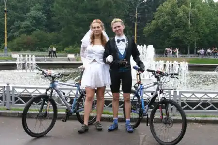 На великах - фу как не красиво, я бы не хотела справлять свою свадьюу катаясь навеликах, мое воображение позваляет прокатится максимум на воздушном шаре!!!