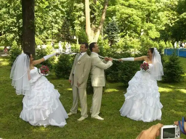 И здесь Витя, и Саша становятся на колена и начинают одновременно сознаваться нам в любви. -Очень интересно, что когда мы на работе сказали, что встречаемся с ребятами близнецами, все спрашивали: ”А кто это вас так познакомил?” Людей приводило в удивление, что всё происходило само по себе. И братья и сестры убеждают, что еще ни разу не перепутали своих любимых. «Мы же абсолютно разные - кто-то нежнее, у кого-то черты лица немного суровей, - уверяет Виктор. - Не заметить разницу можно разве что на расстоянии. Тем более, что уже давно не одеваемся одинаково. Хотя девушки нас очень привели в удивление, когда серьезно доказывали, что одна из них похожая на маму, а другая - на отца. Однако на собственную свадьбу Светлана и Валентина не только выбрали одинаковые платья, а и сделали такие же прически и макияж. «Из-за чего мы их почти не спутали, - улыбаются братья. - Особенно, когда лицо наших невест были закрыты фатой». Вместе пары и венчались. ”Молодой священник сначала тоже растерялся, - говорит Виктор. - Так как в его практике такой случай был первым. Поэтому не знал, з кого начинать”.