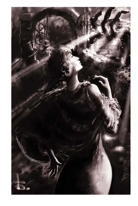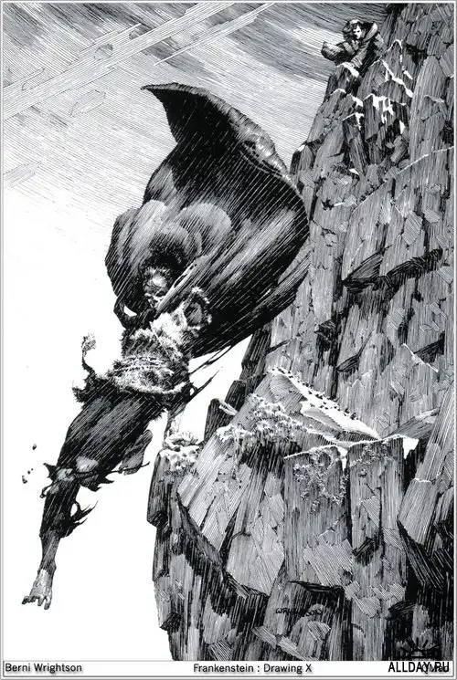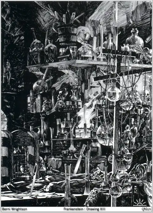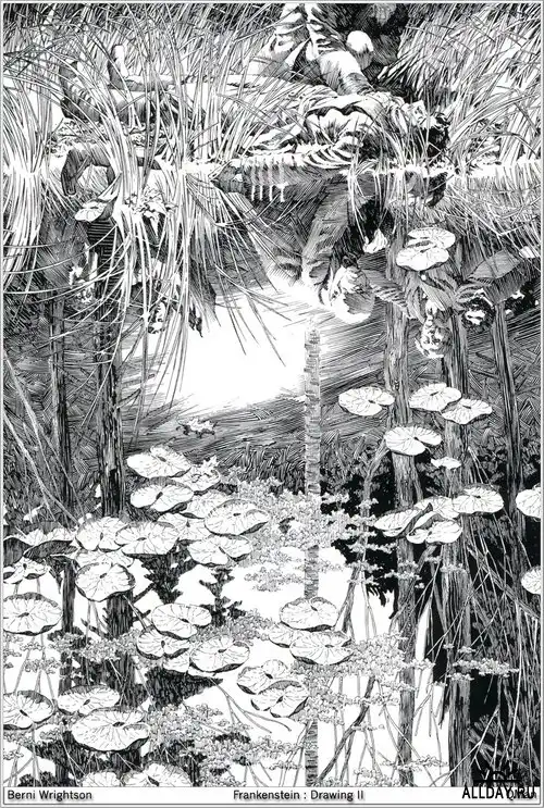 «Лорд Байрон и Шелли часто и подолгу беседовали, а я была их прилежным, — но почти безмолвным слушателем. Однажды они обсуждали различные философские вопросы, в том числе секрет зарождения жизни и возможность когда-нибудь открыть его и воспроизвести „…“ Пока они беседовали, подошла ночь; было уже за полночь, когда мы отправились на покой. Положив голову на подушки, я не заснула, но и не просто задумалась. Воображение властно завладело мной, наделяя являвшиеся мне картины яркостью, какой не обладают обычные сны. Глаза мои были закрыты, но я каким-то внутренним взором необычайно ясно увидала бледного адепта тайных наук, склонившегося над созданным им существом. Я увидела, как это отвратительное существо сперва лежало недвижно, а потом, повинуясь некоей силе, подало признаки жизни и неуклюже задвигалось. „…“ Я не сразу прогнала ужасное наваждение; оно еще длилось. И я заставила себя думать о другом. Я обратилась мыслями к моему страшному рассказу — к злополучному рассказу, который так долго не получался!