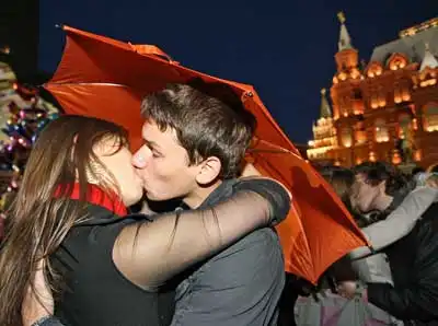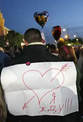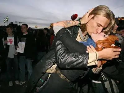 Старт массовым поцелуям был дан, когда организаторы выпустили в небо воздушный шарик - сердечко с руками. Молодежь завопила, в небо полетели другие алые шары-сердца, но целоваться начали немногие. По площади застенчиво прохаживались парни и девушки, держа у груди листочки с сердцами. Другие юноши размахивали надутыми презервативами. Но в общем и целом победило целомудрие.