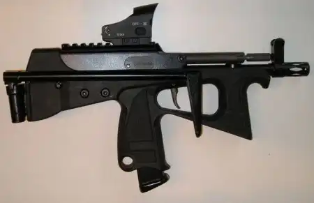 Пистолет-пулемет ПП-2000 современного выпуска (2006 год), со складным прикладом и коллиматорным прицелом; вид справа, приклад сложен