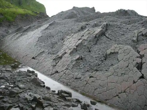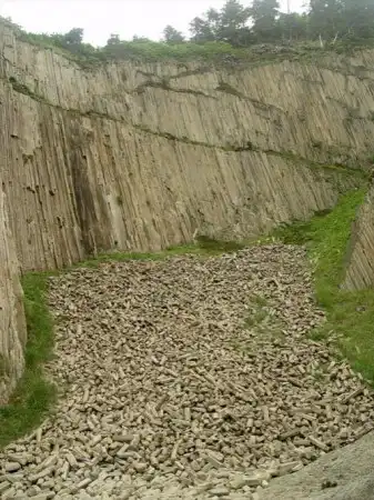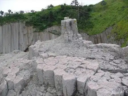 Излившиеся вулканические породы образовали узкие 4, 5 и 6-гранные столбы, так называемые столбчатые отдельности…