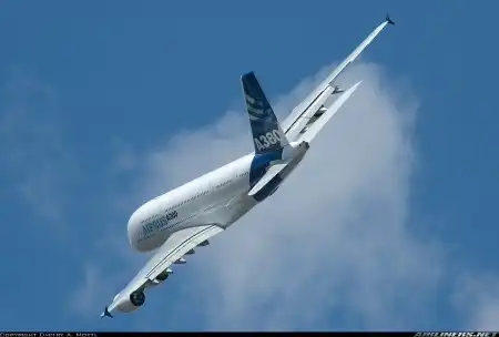 Airbus А380 – самый большой авиалайнер, созданный концерном Airbus. Двухпалубный. Высота 24,1 метра, длина 73 метра, размах крыльев 79,4 метра. Может совершать беспосадочные перелеты на расстояние до 15 200 км. Вместимость – 525 пассажиров (853 – в чартерной конфигурации). Среди больших лайнеров самый экономичный – 3 литра топлива на одного пассажира на 100 километров пути. Имеет четыре двигателя. Также предусмотрена грузовая модификация A380F с возможностью перевозить груз до 150 тонн на расстояние до 10 400 км. Максимальная взлетная масса – 560 тонн (масса самого самолета – 276,8 тонн). Заявленная стоимость одного лайнера – $280 млн. Это на 15% меньше стоимости Boeing 747, который может перевозить 416 пассажиров в стандартной конфигурации (Boeing 747 являлся самым большим лайнером на протяжении 35 лет, но рекорд коммерческого использования до сих пор принадлежит украинскому Ан-225 "Мрия").