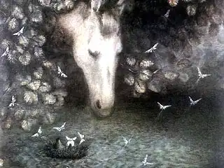 Сознание Ежика переключается на Лошадь и на Туман. Он понимает, что самовнушение не помогает ему забыть о своих проблемах, об одиночестве. Поэтому его заинтересовывает Лошадь, стоящая в Тумане. Я не случайно пишу Туман с заглавной буквы. Туман здесь означает некое состояние забывчивости, уход от реального мира. Для Ежика Туман - место, где можно забыть обо всем, в том числе и о проблемах. Люди часто, подобно Ежику, входят в состояние забывчивости через Туман. Мы уходим от своих проблем при помощи алкоголя, наркотиков и тому подобного, и мультфильм показывает нам самих себя в этом Тумане, что мы чувствуем, что происходит вокруг. Эта сцена - одна из ключевых в мультфильме. Она говорит о том, как легко войти в Туман и не просто выйти.