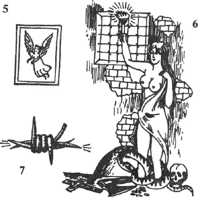 6. Обнаженная женщина с горящим факелом в руке, тюремная решетка, змея, крест, человеческий че-реп, топор, деньги. "Ничто не вечно в этом мире". "На все воля Божья". Татуировка лагерного авторите-та. Может сопровождаться текстом о бренности мирского существования. Наносится только на грудь.