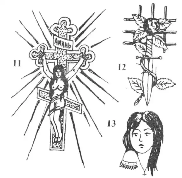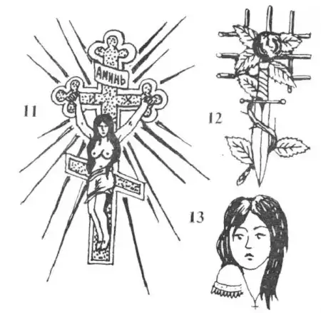 11. Обнаженная женщина, распятая на кресте с надписью "Аминь". "Я сполна отомстил за измену". Аб-страгированный символ мести (не обязательно женщине). Наколка наблюдается среди воровских лиде-ров и наносится на грудь или бедро.