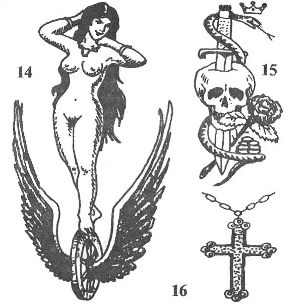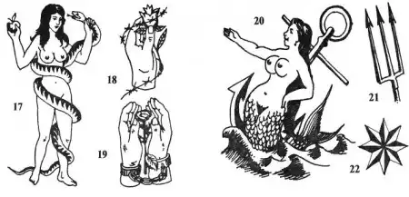 20. Русалка на якоре. Встречается у моряков и у лиц, отбывавших наказание за изнасилование или раз-вратные действия. Реже наблюдается у пассивных гомосексуалистов. Татуировка наносится на грудь или спину.