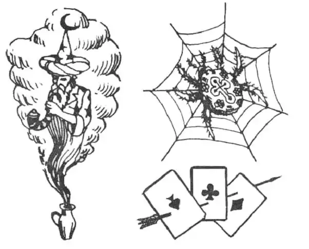 33 и 34. Татуировки наркоманов. Джинн, вылетающий из кувшина. Наносится на грудь, плечо или пе-реднюю часть бедра. Паук в паутине может выкалываться на голове под волосами. Паук без паутины означает карманника.