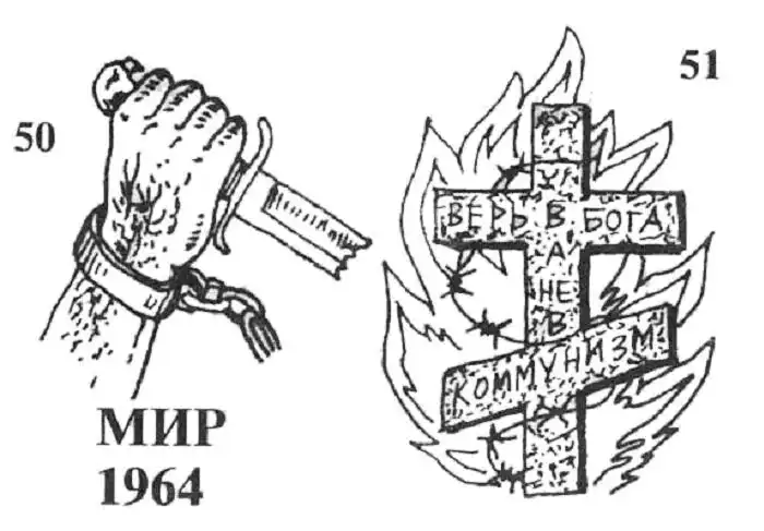51. Крест, объятый пламенем, с надписью "Верь в Бога, а не в коммунизм". Политическая татуировка. Как правило, ее наносили политзаключенные.