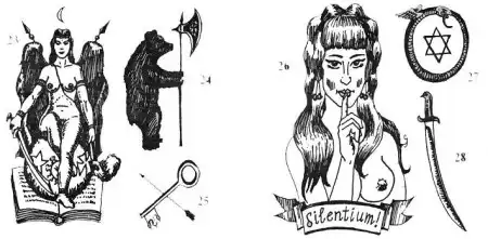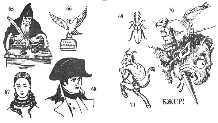 70. Рука с кинжалом, пронизывающая дьявола. Наколка антисемитов. "Бей жидов, спасай Россию!", "Убийство еврея не преступление, а очищение мира от посланников Сатаны". Подобные татуировки считались политическими и уничтожались.