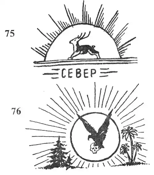 76. Орел меж двух деревьев разных климатических поясов. Означает вора-гастролера и склонность к побегу. Череп в когтях символизирует насилие.