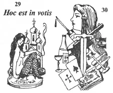 30. Женщина, пистолет, деньги, бутылка, шприц, нож карты. "Вот, что мы любим" или "Вот, что нас гу-бит". Символизирует разгульную жизнь, расточительство.