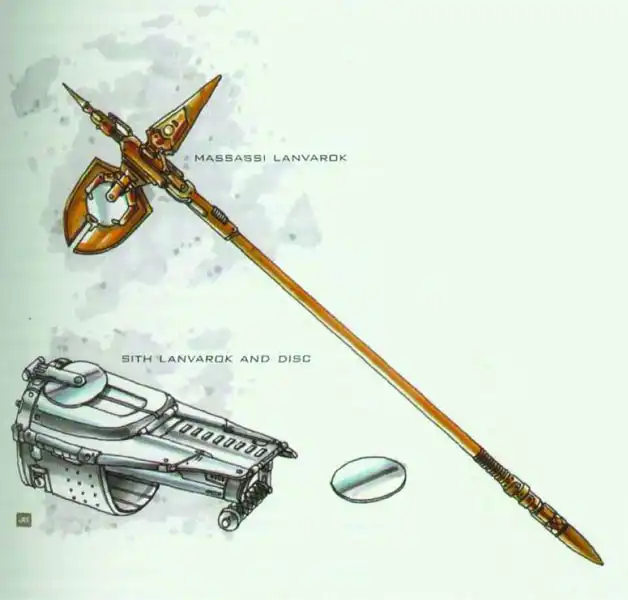 Также потомками ситов,улетевших с Темным Лордом Нагой Садовым на Явин 4,использовались другие образцы ланвароков.Они представляли собой двуручные шесты-секиры,с помощью которых и запускали диски.После запуска секира использовалась,как самостоятельное оружие.