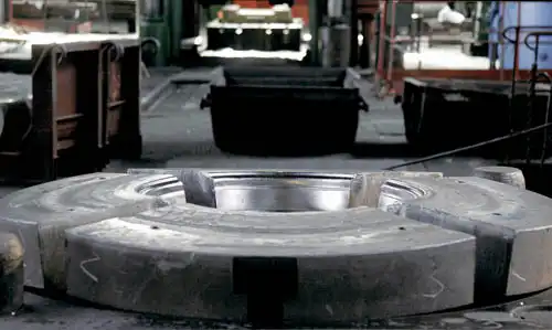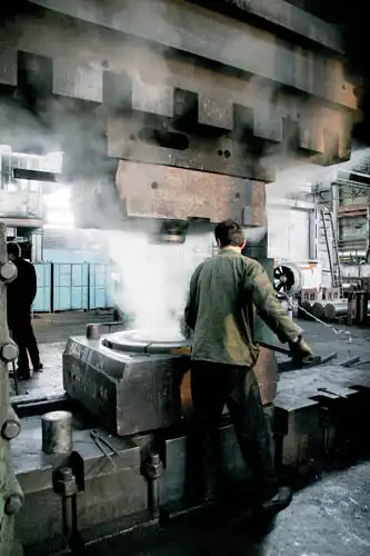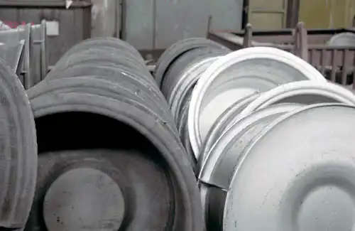 Там эти заготовки, пока даже отдаленно не напоминающие колесные диски, разогревают и с помощью пресса «осаживают» – сплющивают, превращая в «блинчики» толщиной сантиметров двадцать и диаметром около полуметра. Процесс дальнейшего превращения в колеса происходит в несколько этапов. Сначала «блинчики» разогревают до 4300С и с помощью предварительного штампа (разогретого примерно до 3500С) превращают в «кастрюли» – предварительные заготовки для автомобильных колес.