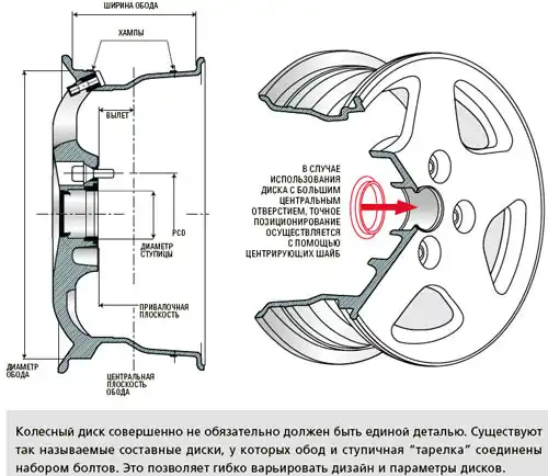 * d63.3 – диаметр центрального отверстия (ступицы) в миллиметрах. Обеспечивает центрирование колеса на ступице. Иногда диски делают универсальными, с большим центральным отверстием, а точное позиционирование осуществляется центрирующими шайбами.