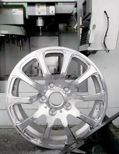 С заготовки, уже напоминающей по форме будущее колесо, на токарном станке снимают лишний припуск металла, в ободе просверливают ниппельное отверстие, а в ступичной части – крепежные отверстия под болты. Затем колесо устанавливают на фрезерный станок с ЧПУ, который и вырезает запрограммированный дизайн.