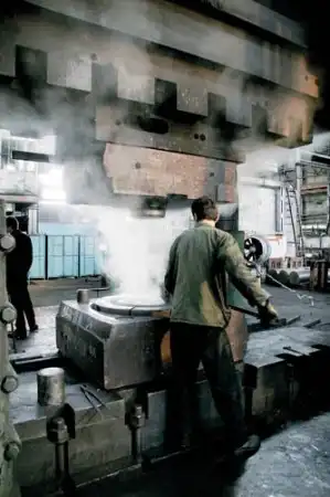 «Кастрюли» вновь отправляются в печь для разогрева, а затем специальный конвейер подает их к прессу с другим установленным штампом – окончательным. «Пауза между выходом заготовки из печи и собственно штамповкой не должна быть больше 11 секунд, иначе заготовка остынет ниже критической температуры», – поясняет Александр. Один из рабочих смазывает разогретый штамп специальной смазкой, двое других ловко хватают «кастрюлю» длинными щипцами и переносят на пресс-форму. Верхняя часть пресса опускается, поднимается – и вот из-под пресса достают готовое, если не считать облоя (излишков материала, выдавленных при штамповке), колесо. Первые четыре отштампованных колеса после освоения нового штампа идут на контроль геометрии – только после этого дается разрешение на использование штампа для серийного производства дисков.