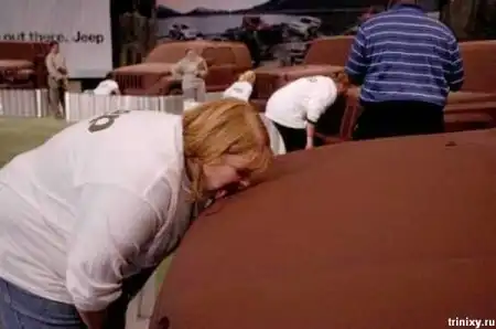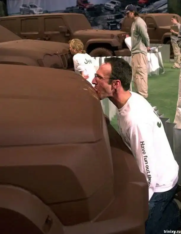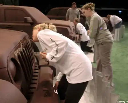 Участникам, которые регистрировались онлайн, надо было слизать слой шоколад с решетки джипов.