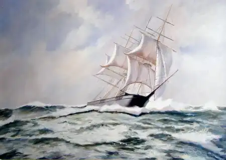 "Около 0.15 ночи мы увидели странное свечение впереди по ходу с левого борта. Стояла кромешная темнота, была сплошная облачность, луна не светила. Мы посмотрели в бинокль и корабельный телескоп и различили светящиеся очертания плывущего корабля, двухмачтового, пустые реи тоже светились, парусов видно не было, но между мачтами наблюдалась легкая светящаяся дымка. То не были навигационные огни. Судно, казалось, двигалось прямо на нас, и скорость его была такой же, как наша. Когда мы его заметили в первый раз, оно находилось от нас где-то за две-три мили, а когда оно было от нас в полумиле, оно внезапно пропало.