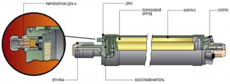 Тогда конструкторы предложили вставить между секциями ракетные пороховые двигатели, сопла которых были направлены назад и немного вниз. Реактивная струя приподнимала заряд и тянула его вперед. На заряд полной длины требовалось 45 таких двигателей.