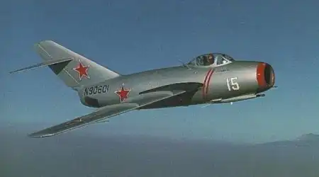 Несмотря на то, что МиГ-15 неоднократно публично демонстрировался в 1949г. (в частности, участвовал в воздушном параде в июле 1949г. в Тушино), его высокие характеристики и использование в больших количествах в Корее во время войны 1950-1953гг. стали, по свидетельству зарубежных историков, неожиданностью для американцев. В Корее применялись МиГ-15 и МиГ-15бис китайских и советских В ВС и использовались они главным образом для прикрытия объектов КНДР от воздушных налетов. Одной из первых в Северный Китай для противовоздушной защиты объектов КНДР прибыла 324-я дивизия, которой командовал И.Н. Кожедуб. Первые МиГ-15 с опознавательными знаками КНДР появились в корейском небе 8 ноября 1950г. Вначале они сталкивались в воздушных поединках с американскими истребителями Локхид F-80 "Шутинг Стар" (первый реактивный истребитель ВВС США) и Рипаблик F-84 "Тандерджет", значительно уступавшими МиГу-15 по характеристикам. Американцы срочно ввели в действие свои новейшие по тому времени реактивные истребители Норт Америкен F-86 "Сейбр", которые (в вариантах F-86А и F-86E) использовались для сопровождения групп бомбардировщиков и стали основным воздушным противником МиГов. Первое столкновение МиГ-15 и F-86 в воздухе произошло 17 декабря 1950г. - это был первый воздушный бой истребителей со стреловидным крылом.