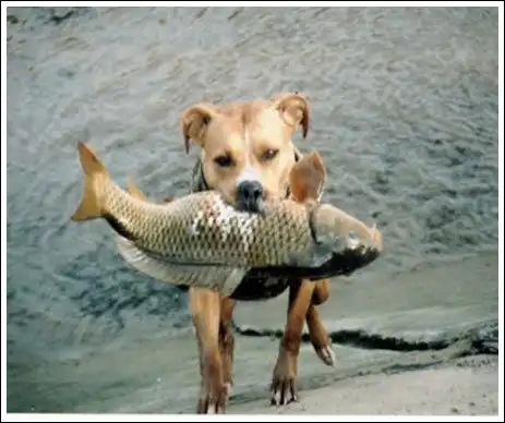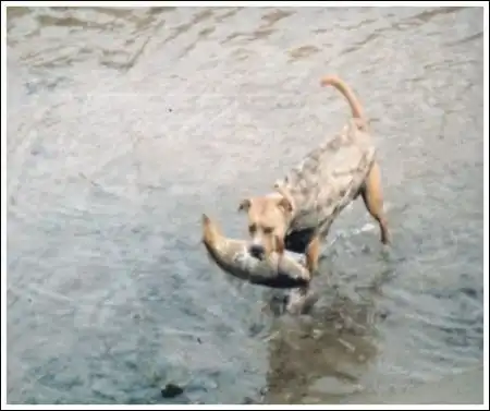 Какой молодец! Мужики, надо иметь такого пса. Собрались на рыбалку, взяли с собой песика и огненной воды. Он ловит, а вы, не отвлекаясь на эти глупости, принимаете на грудь. Вот так...