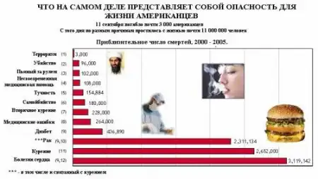 По крайней мере, 400 000 американцев в прошлом году расстались с жизнью из-за того, что ели всякое барахло. Болезни сердца – это «убийца № 1» в мире. Часть этих болезней, безусловно, связана с генетикой, но большинство произошли из-за количества и качества поглощенных жира, сахаров, ненатуральных продуктов, и так далее. Хотя, возможно, это очень приятный способ расстаться с жизнью. А что? Пончик, еще пончик, а сверху – взбитые сливки.